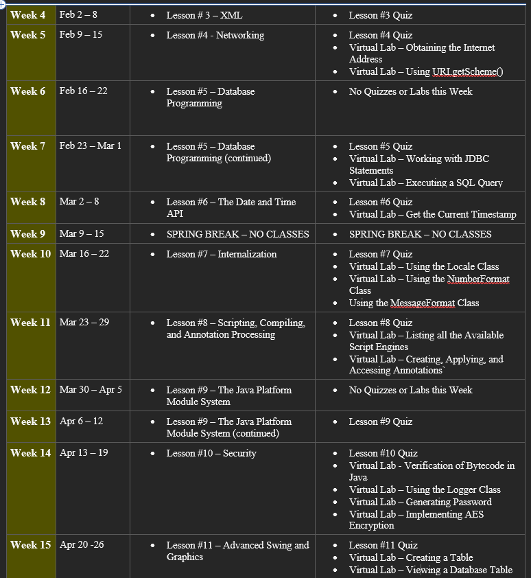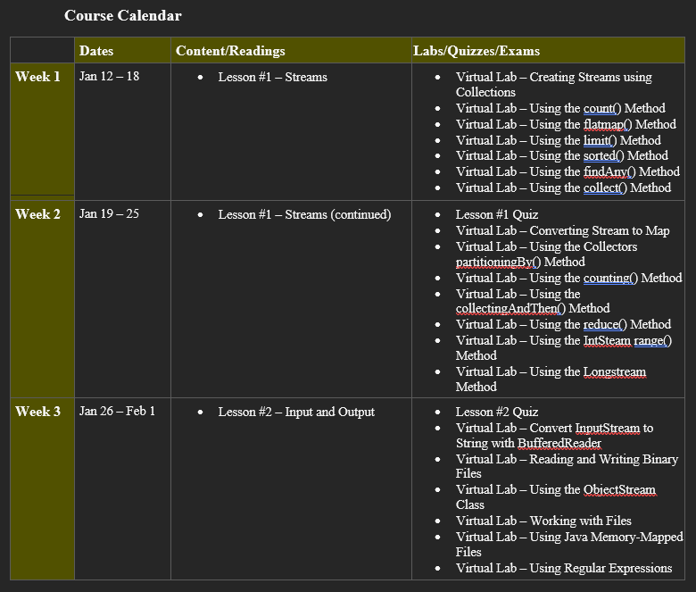 Through interactive e-book lessons, videos, hands-on labs, quizzes, and assessments, students gain practical experience with Java Streams, advanced I/O, XML processing, networking, database programming with JDBC, modularization, security, internationalization, scripting, annotations, and native method integration. Learners will work with modern Java constructs such as parallel streams, the Java Platform Module System, the Date and Time API, and advanced security mechanisms including encryption, authentication, and digital signatures.